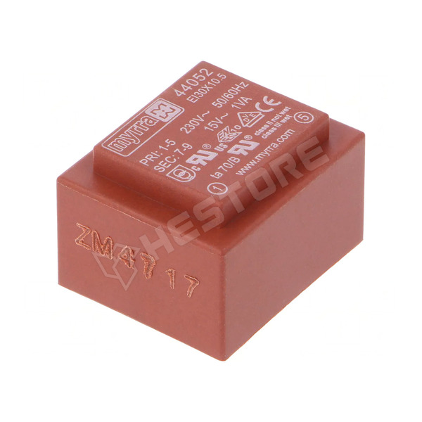 PCB transzformátor, kiöntött, EI30, 1VA, 230V AC, 15V, 67mA