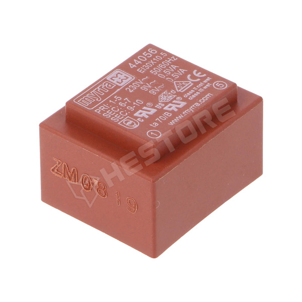 Transzformátor, kiöntött, 1VA, 230V AC, 2x9V, 2x56mA, PCB