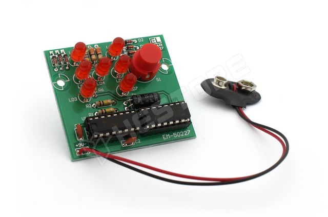 A társasjátékokban használatos dobókocka elektronikus megfelelője. Ez a kis áramkör kiválthatja hagyományos dobókockát. Ajánljuk társasjátékokhoz, és az elektronikával most ismerkedőknek egyaránt. Működése: a gomb megnyomása után a kijelzőn egyre lassulva jelennek meg a számok. Amikor ez a változás megáll (kb. 2-3 mp), akkor a dobás végeredménye látszik.