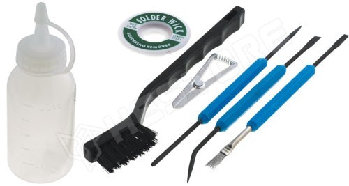 3 db. kétoldalas eszköz a forrasztás előkészítéséhez és javításá, 100 ml-es tartály adagolóval folyatószernek vagy tisztítószernek, kefe ESD, forrasztásnál keletkező meleget elvezető csipesz, amely megakadá, kiforrasztó szalag 2mm x 1,5m |