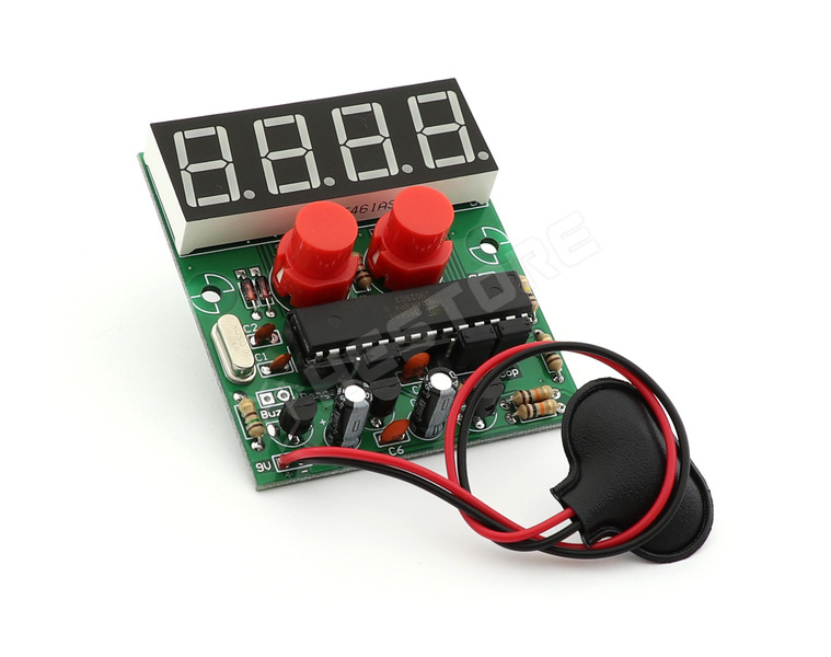 Ebből a KIT-ből egy olyan áramkör építhető, ami stopperként vagy programozható időzítőként jó szolgálatot tehet akár a sportpályán, akár otthon a konyhában. Az áramkör egy előre felprogramozott AVR mikrovezérlőre épül, mely beállító kapcsolókkal (jumper) valamint 2 nyomógomb segítségével programozható és működtethető. Az áramkörnek alapvetően két funkciója van: nulláról indítható módban stopper, egy előre bállított értékről visszaszámolva pedig időzítőként használható. A számolási tartomány a tized másodpectől egészen több óráig is beállítható. Visszaszámláló módban ráadásul még vissza is állhat a beállított értékre, vagyis folyamatosan jelez a beállított időnként. A LED kijelőn felül hangjelzéssel is ellátható (lásd opcionális csipogó) így akár zenei metronomként is használható.