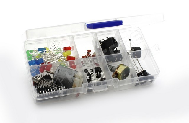 Alkatrész kezdőkészlet, DC motor, L293, 74HC595, MAX7219, NPN+PNP, rekeszes dobozban