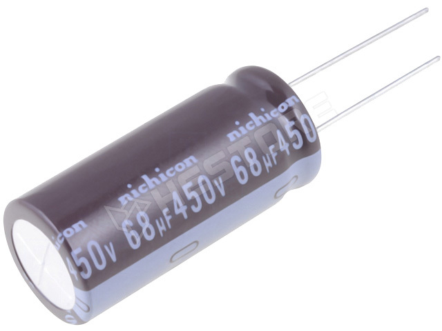 Kondenzátor, elektrolit, 68µF, 450V, 7.5mm, hosszú élettartam, nagy megbízhatóság, Ø16 x 35.5mm, -25...105°C