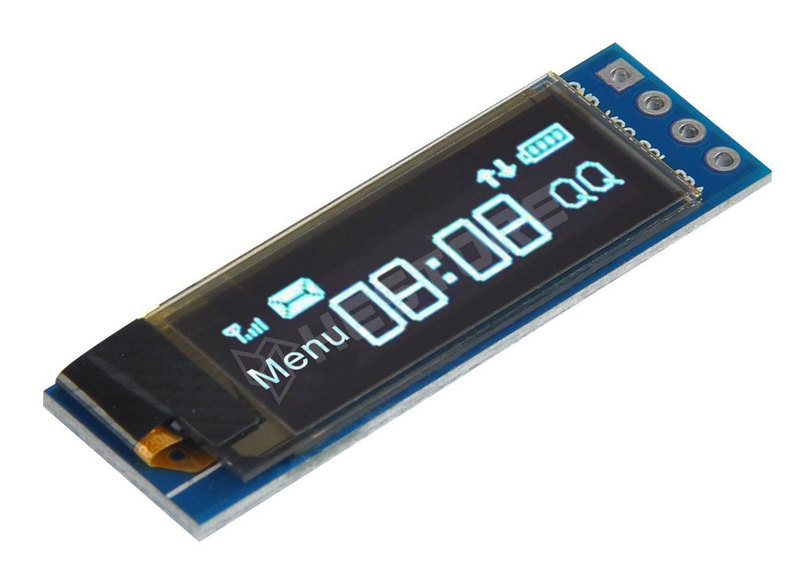 0.96in 128x64 OLED, I2C interfész, GND, VCC, SCL, SDA, fehér