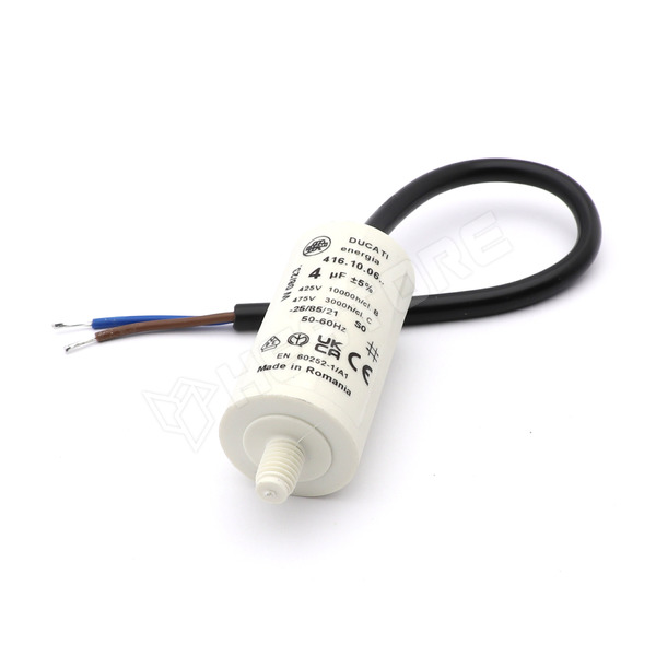 Motor kondenzátor, motorokhoz, üzemi, 4µF, 425V AC, Ø28x55mm, vezetékek 250mm