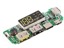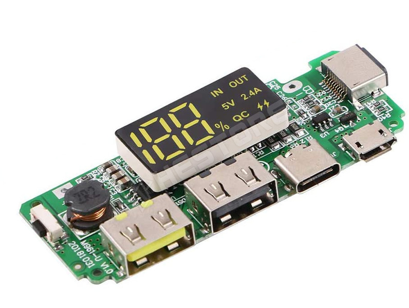 Power bank modul, 5V 2.4A kimenet, 3.7V-os Li-Ion és Li-Po akkumulátorhoz, töltő elektronikával, USB-C, microUSB, USB-A, Lightning, QC3.0