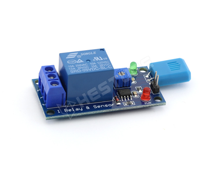 A kapcsolásban a HR202 rezisztív páratartalom-érzékelő egy feszültségosztó részeként működik, melynek ellenállása a levegő relatív páratartalmától függően változik. Az osztó feszültségét egy LM393 komparátor hasonlítja össze a potméterrel beállított referenciafeszültséggel, így meghatározza, hogy a páratartalom a beállított határérték fölé vagy alá esik-e. A komparátor kimenete egy tranzisztort vezérel, amely a relét meghúzza vagy elengedi, ezáltal külső eszközt (pl. ventilátort vagy párásítót) kapcsol automatikusan a mért páratartalom alapján.