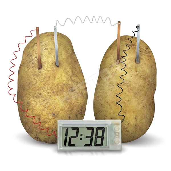 A burgonya képes működtetni egy órát? Naná, hogy képes rá, réz és magnézium elektródák segítségével. Sőt, burgonya helyett használhatsz almát, citromot, narancsot, paradicsomot, kólát, vagy akár vizet is. A titok az enyhén savas közeg, ami kémiai folyamatokat indít be a réz és a magnézium elektródák között.