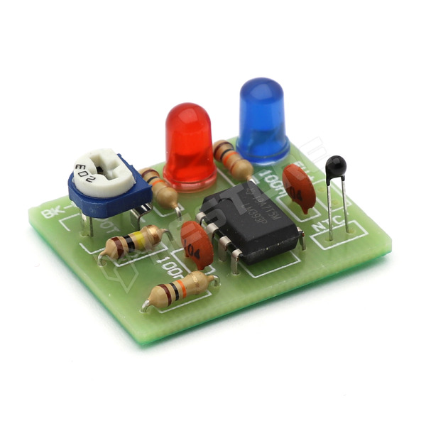 Komparátor IC-vel felépülő hőmérséklet érzékelő KIT, mely egy NTC segítségével méri a hőmérsékletet, és a potenciométerrel beállított küszöbértéknek megfelelően egymást váltó piros/kék (meleg/hideg) fény jelzést ad.