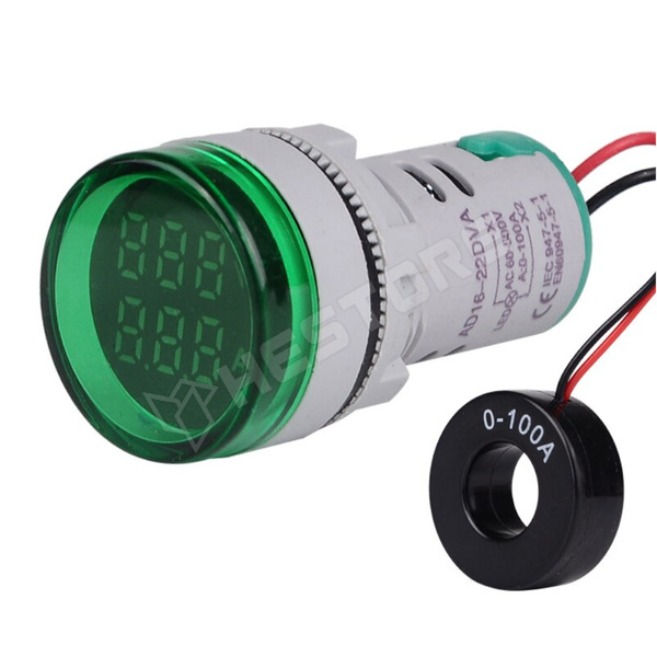 20...380V AC, 0...100A, LED, Feszültség és áram mérő indikátor árammérő tekerccsel, Zöld