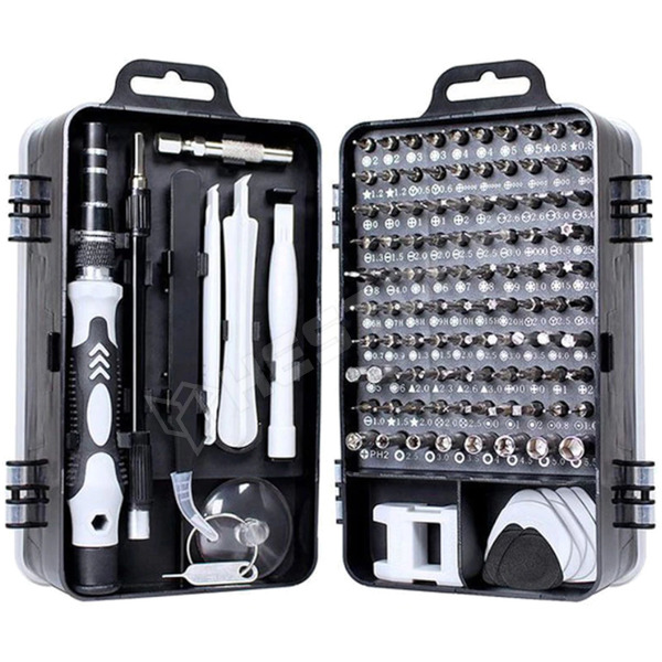 115 in 1 csavarhúzó készlet, műanyag feszítőszerszámokkal, SIM tűvel, csipesszel és demagnetizálóval, szürke-fekete