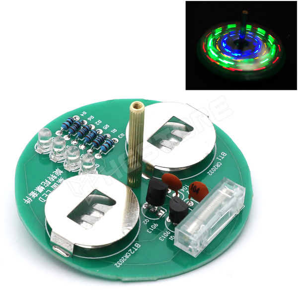 Ebből az építőkészletből egy négy LED-es búgócsiga építhető. A 2db CR2032 elem (nem tartozék) behelyezése után, ha megpörgetjük a búgócsigát, a LED-ek elkezdenek világítani.