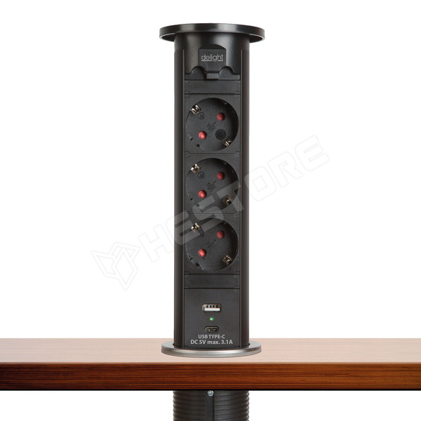 Motoros rejtett elosztó - fekete, 3 x 250 V + USB-A, Type-C