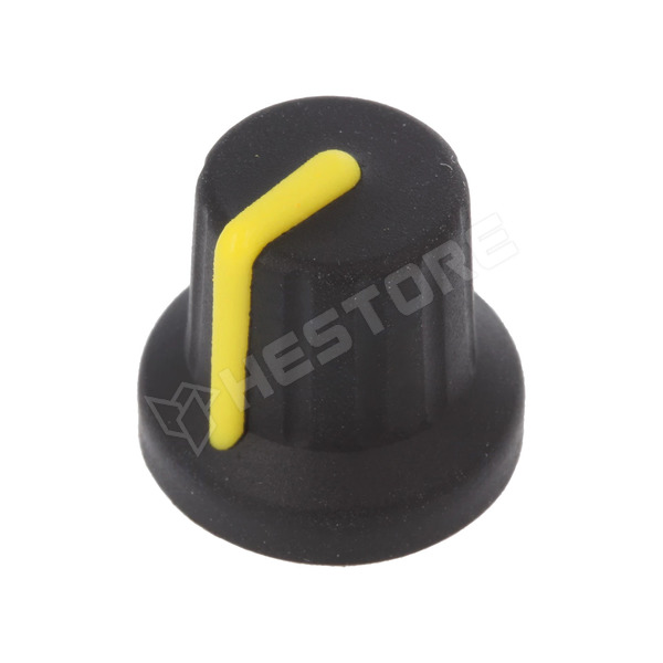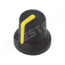 Potenciométer gomb, gumi, műanyag, Ø6mm fogazott tengelyre, Ø16x15.1mm, fekete, sárga jelzéssel