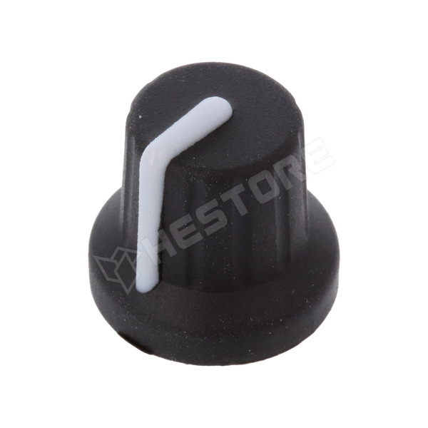 Potenciométer gomb, gumi, műanyag, Ø6mm fogazott tengelyre, Ø16x15.1mm, fekete, szürke jelzéssel