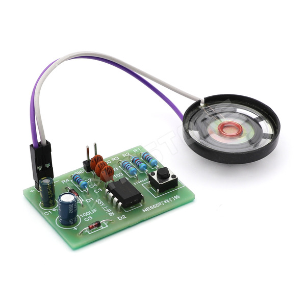 Ebből a készletből egy NE555-ös csengő építhető. A gombot nyomvatartva egy hangon sípol, majd a gombot elengedve kb. 1 másodpercig mélyebb hangon sípol.
