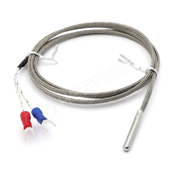 K típusú hőmérséklet mérő szonda, hőelem, Ø4 x 30mm, fémsodrony árnyékolás, villás kábelsaru, 1m