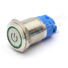 Vandálbiztos nyomógomb, Ø16mm, 12...24V AC/DC zöld LED power szimbólum, SPDT, ON-(ON), 1 stabil pozíció, IP65
