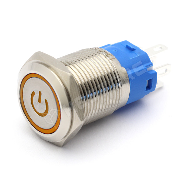 Vandálbiztos nyomógomb, Ø16mm, 12...24V AC/DC sárga LED power szimbólum, SPDT, ON-(ON), 1 stabil pozíció, IP65