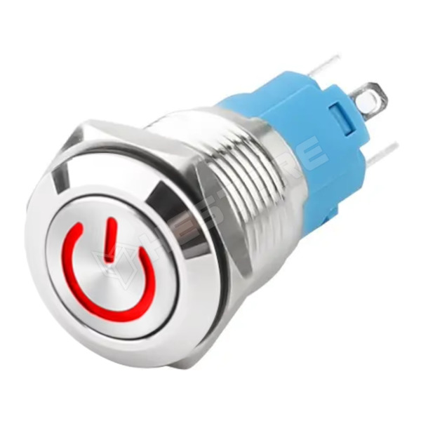 V12PLF-RD / Vandálbiztos nyomókapcsoló, Ø12mm, 12...24V AC/DC piros LED power szimbólum, SPST, OFF-ON, 2 stabil pozíció, IP65
