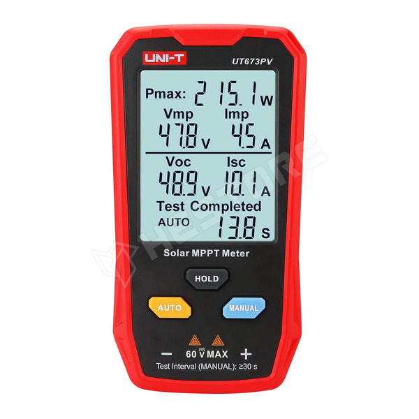Lehetővé teszi a maximális teljesítmény (Pmax), a nyitott körű feszültség (Voc) és a rövidzárlati áram (Isc) egyidejű mérését, és az összes paramétert egyszerre jeleníti meg a kijelzőn.