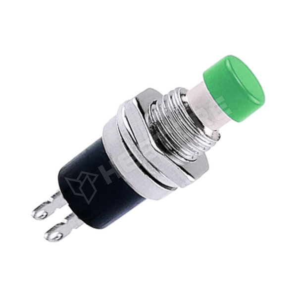 Nyomógomb, Ø7mm, 250V AC/1A, SPST-NO, OFF-(ON), 1 stabil pozíció, zöld