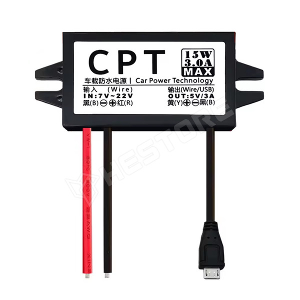 DC-DC step down modul, 7...22V DC to 5V DC, 3A, 15W, vízálló, kimenet: egyenes USB-micro dugó