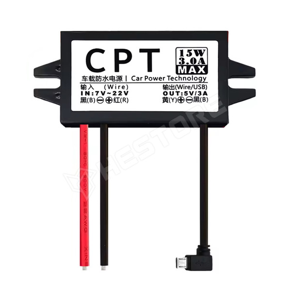 DC-DC step down modul, 7...22V DC to 5V DC, 3A, 15W, vízálló, kimenet: 90°-os USB-micro dugó